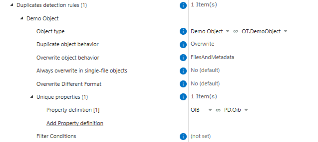 When importing data from a file system to M-Files, you can enable Duplicates detection to ensure objects are unique. Define the unique properties, and choose how to handle duplicates: skip, overwrite, or create new objects (Picture 2).