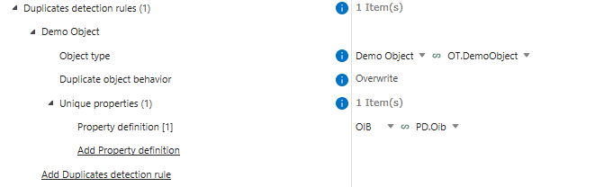 When creating objects, you can define properties that must be unique and choose how duplicates are handled (Duplicate object behavior):