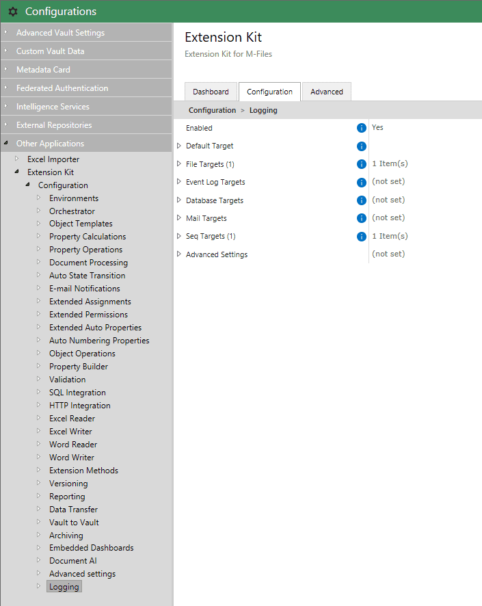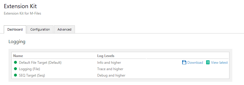 Within the configuration, you can define one or more targets (locations where logs will be exported). The Default File Target refers to logs that can be downloaded directly from the Dashboard: