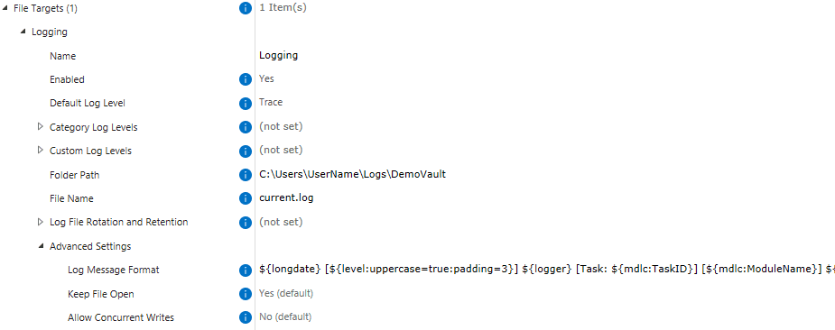 - The Default Log Level can be adjusted based on your needs and can be set to Trace, Debug, Info, Warning, Error, or Fatal. A recommended best practice is: