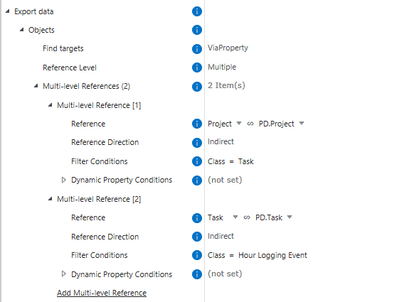 A multi-level reference is a chain of connected objects that helps you reach target objects through multiple reference levels. Each level can be filtered, and connections can be direct or indirect.