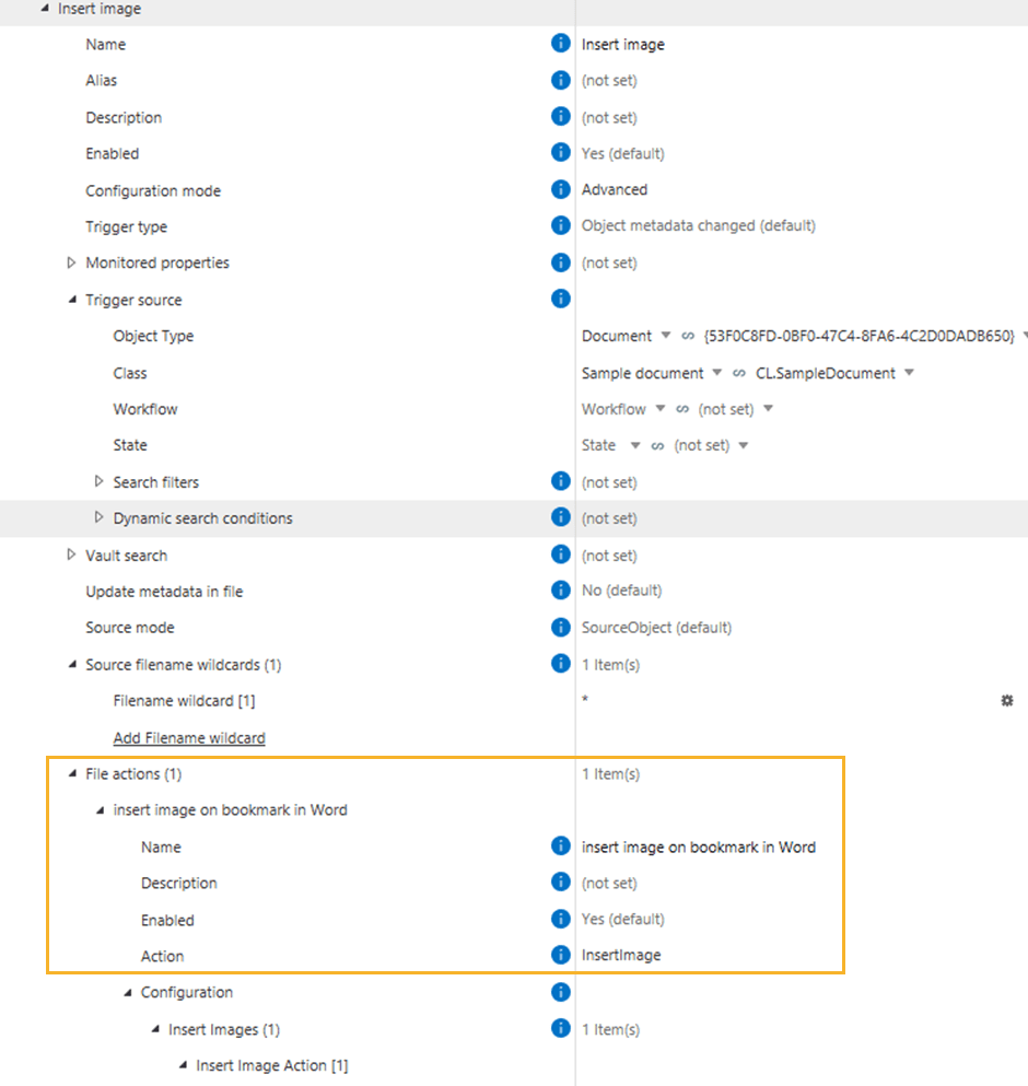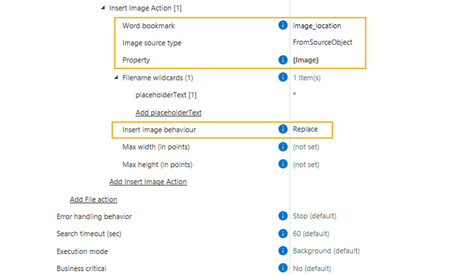 - Choose the action: Under File actions, select InsertImage to insert the image into a specified bookmark in the Word document (Picture 4).
